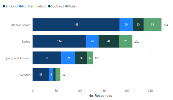 Whilst overall most herds were AYR calving, Wales had a higher proportion of spring calving herds and there was significant representation of seasonal calving herds from all 4 nations. In the beef sector spring calving was most prevalent with 187 of 339 (England 178, Scotland 81, Wales 54 and N Ireland 39) herds with breeding beef animals being spring calving and 93 having both spring and autumn blocks. Unsurprisingly those farms with breeding dairy animals and no beef breeding stock (England 178, N Ireland 31, Wales 31 and Scotland 16) were responsible for massively increasing the overall number of farms AYR calving with 173 out of 263 falling into this category, 46 autumn calving, 30 having both a spring and autumn block and only 14 spring calving.
