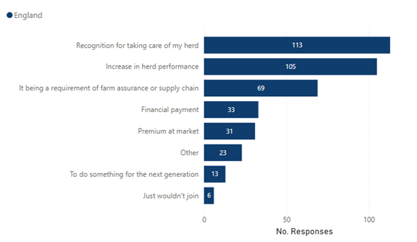 The top 3 reasons that respondents had or would engage with BVD free England were- recognition for taking care of their animals (113), increased herd performance (105) and it being a requirement for herd assurance scheme (69). The vast majority, 85%, of English respondents thought that eradication should be made compulsory. Fewer people saw financial payment and premiums paid at market as a reason to engage with the control programme and 6 people said they just wouldn’t join.