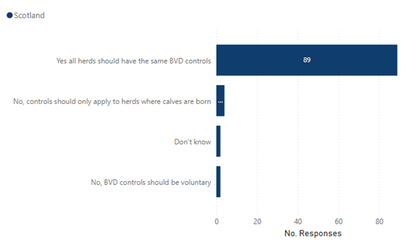 Here, where the eradication scheme is mandatory, the number who perceived there to be no benefit from engaging with the scheme was significantly lower at 33%, and 46% felt they had an overall healthier herd (vs Wales at just 27%). When asked whether the scheme should essentially be a one size fits all with all herds adhering to the same rules there was an overwhelming feeling (92% of replies) that this should indeed be the case. Only 2% thought that BVD control should be voluntary and 4% thought it should be limited to breeding herds where calves are born.