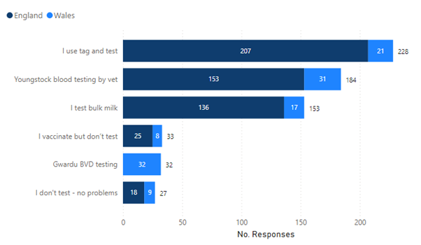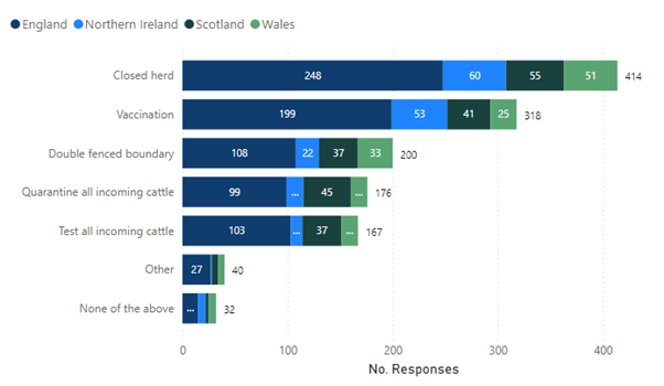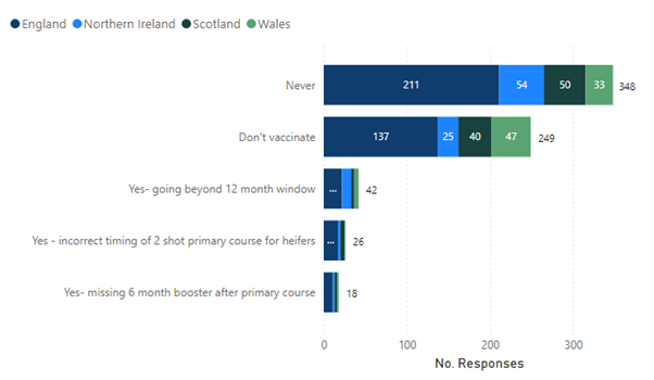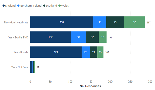 Overall, 386 (60%) of respondents reported using vaccination across the nations with a fairly even split between dead (Bovilis, MSD Animal Health) and live (Bovela, Boehringer Ingelheim Animal Health UK) vaccines commercially available in the UK.