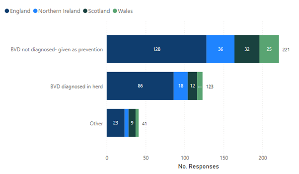 Overwhelmingly vaccines were being used as part of a preventative plan in herds where BVD had not been diagnosed (58%), BVD had been diagnosed in 32% of vaccinating herds whilst the remaining 10% said other reasons were behind their decision to engage with vaccination