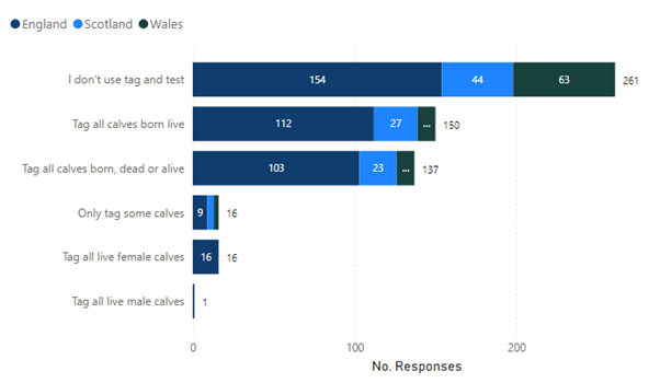 it is interesting to see the animals that people are choosing to tag, or not. From those using this form of testing (320), only 137 (43%) are tag and testing all calves born dead or alive whist 150 (47%) are only tagging calves born alive and the remainder were only tagging some calves, mainly live heifer calves (5%). This remains similar to the 2021 survey results where 45% were tagging all calves born dead or alive. There is still clearly some work to be done here in providing robust education and reasoning behind the importance of tagging all calves whatever their status especially as there are more people tagging only live calves than all calves born alive or dead.