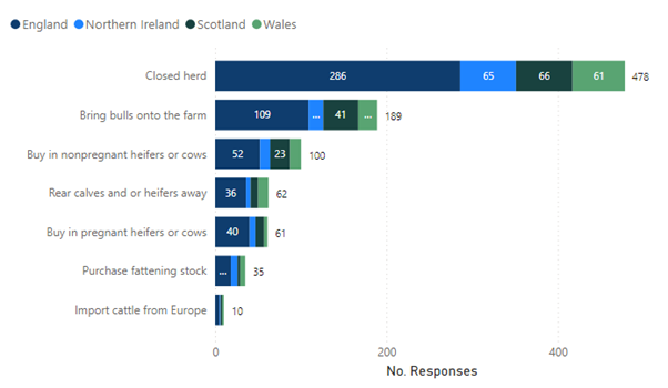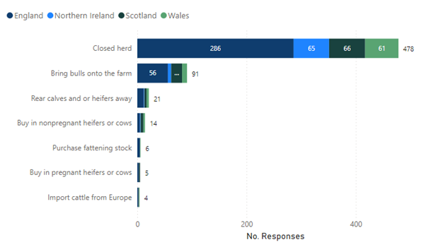 Of those that claimed to be a closed herd there was still a significant number within this category who were buying in cattle or rearing youngstock away that would return to the source farm. Particularly evident and worrying was the 91 “closed herds” that were in fact bringing bulls on to the farm. This poses a particularly high risk in herds that may be naïve to and therefore highly susceptible to BVD unless there is a robust quarantine, biosecurity control and vaccination strategy in place. It also brings in to question the definition of a closed herd in it’s true sense and raising awareness of BVD and other infectious diseases that could enter a farm in this way.