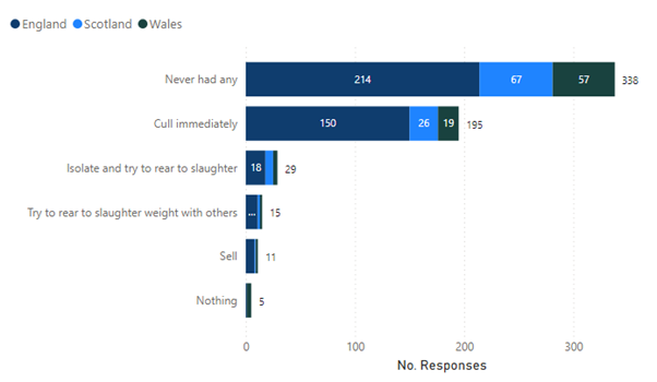 Whilst 338 herds had never knowingly had a PI, and 195 respondents had culled identified PIs immediately, there were still 60 respondents who had not done so. PI animals were retained because the farmer either thought they looked healthy or doubted the PI test result. 44 tried to rear to slaughter, 5 did nothing and 11 (England 8, Scotland 1 and Wales 3) actually sold animals that they knew to be confirmed PIs . Encouragingly 98% of those who had kept a PI in the past said they would not do it again.