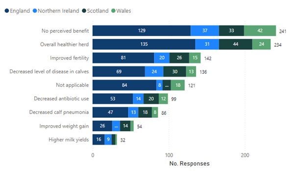 Although 38 (41%) of NI respondents did not report seeing any perceived benefit from engaging with their national scheme, 33% felt their herd was healthier overall, 26% saw a reduction in calf diseases, 22% saw improved fertility and 15% had reduced their antibiotic usage as a result.